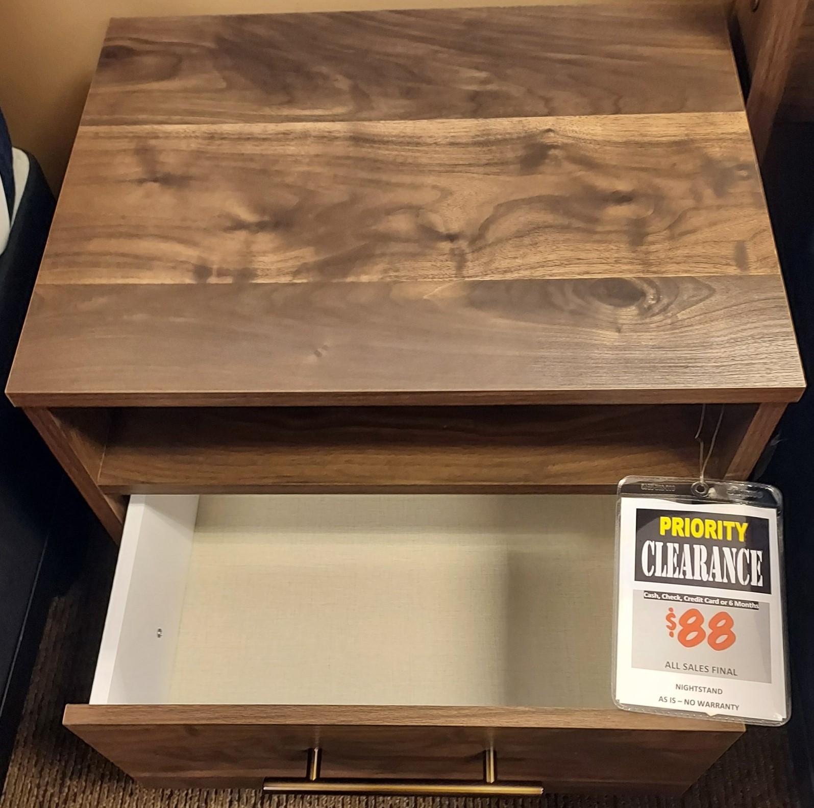 At the intersection of industrial cool and chic sophistication you’ll find this nightstand. With a rich brown finish over replicated walnut wood grain, paired with a burnished goldtone handle, it offers an authentic touch that plays well any way you style it. Simple and elegant in its design, this piece keeps your home decor grounded while elevating your modern style.