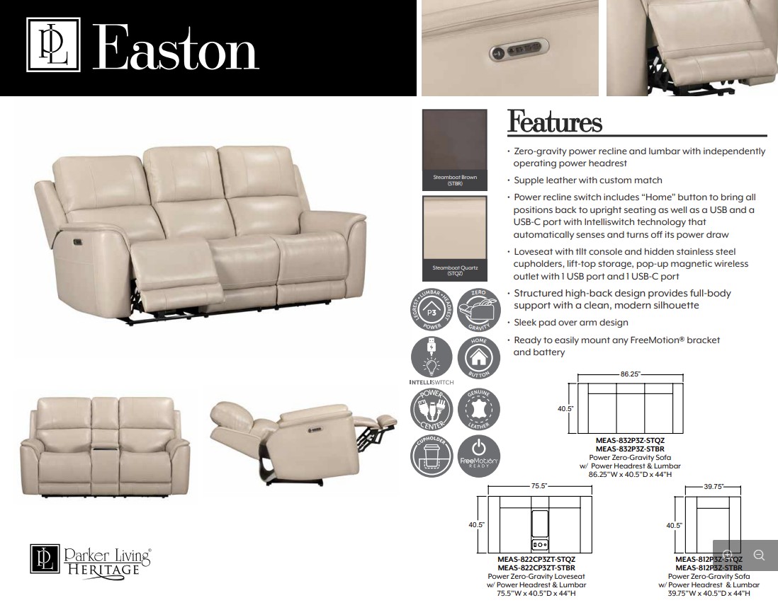 EASTON POWER SOFA W/ZERO GRAVITY WITH POWER HEADREST AND LUMBAR- STEAM BOAT BROWN Original price was: $3,129.99.Current price is: $2,499.95.