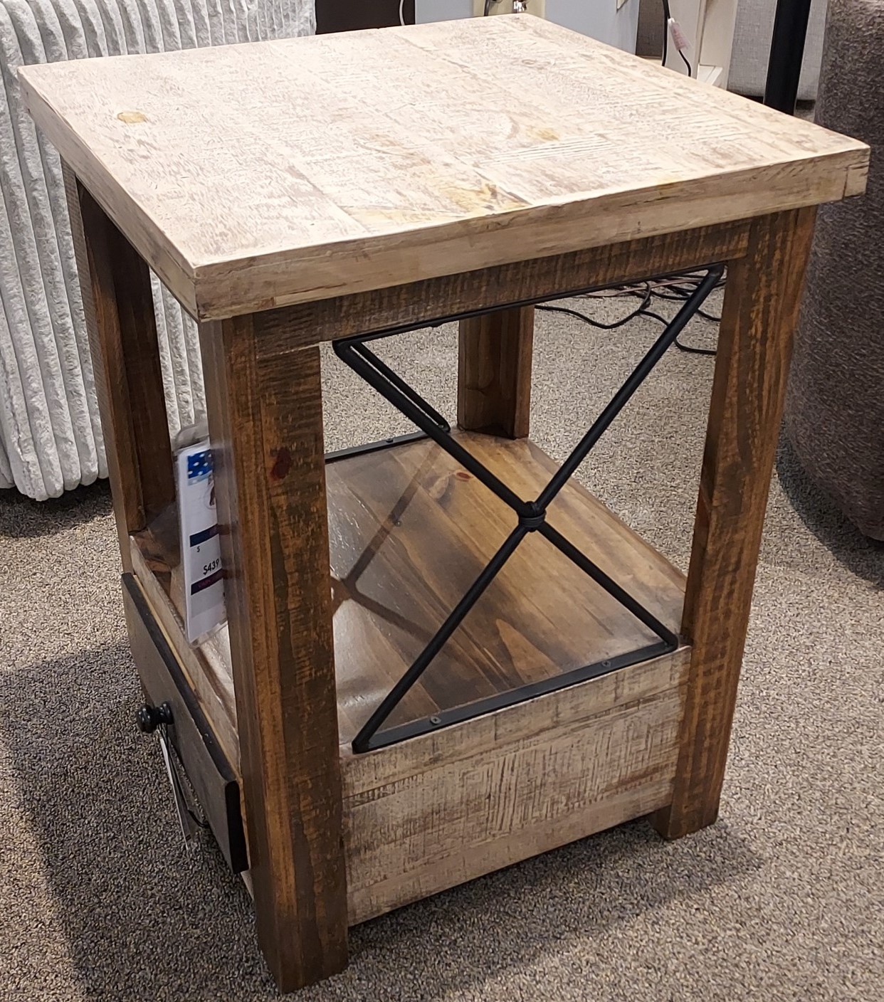 Solid Pine wood. Hand applied multi-step lacquer finish. Hand applied multi-step lacquer finish is smooth to the touch with rustic character. Mortise and tenon joinery offer durability for years to come. Wrought iron “X” on sides adds perceived value. English dovetailed fronts and metal pulls on drawers. Wooden glides. End and Chairside table feature one functional drawer. Width 19″ (48.3 cm) Depth 19″ (48.3 cm) Height 26″ (66 cm)